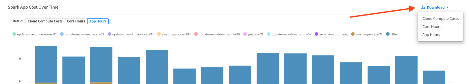 The top part of the cost analysis page is a bar chart showing your Spark application usage metrics on the cluster over time.