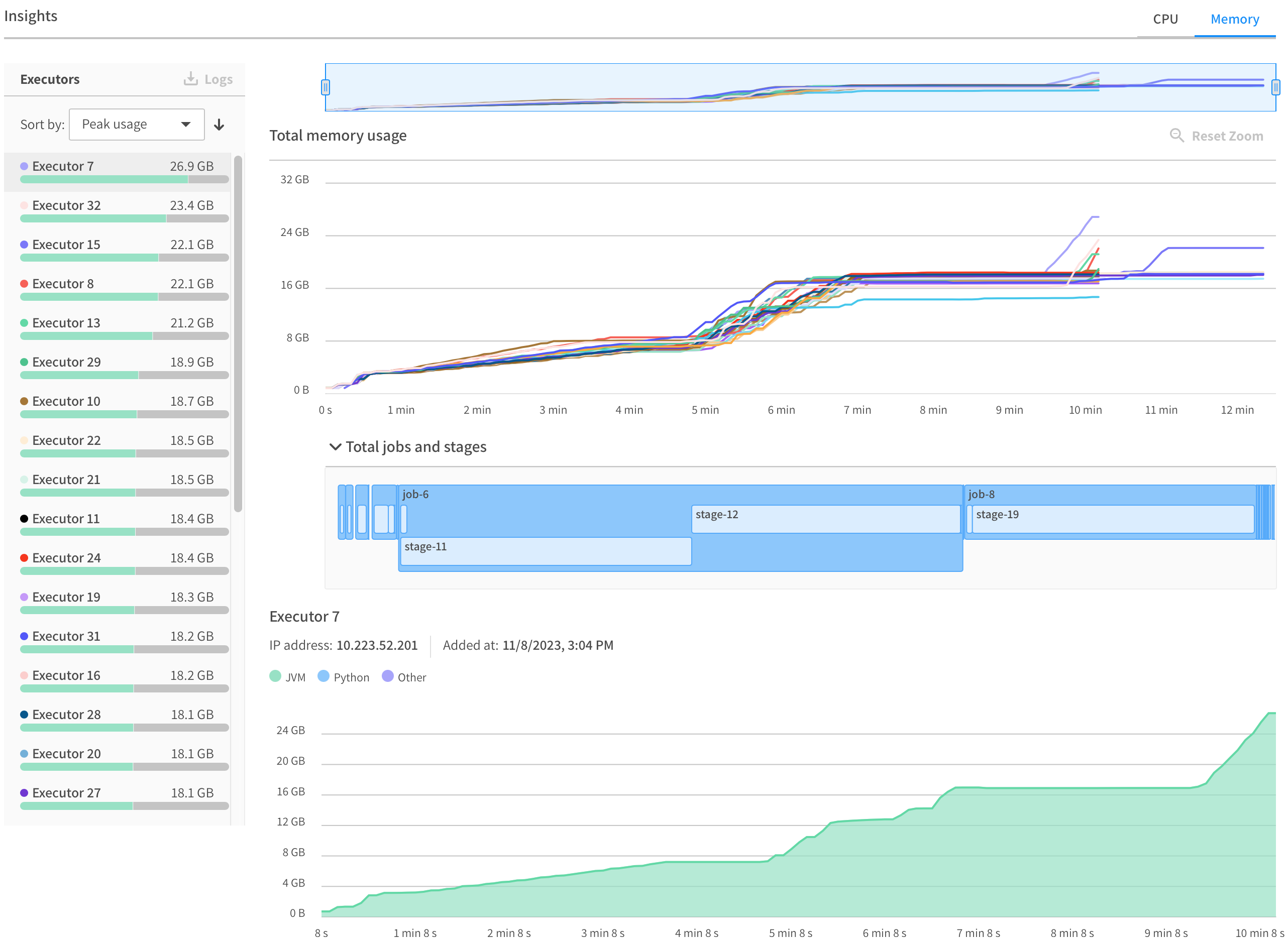 The second tab provides a report of the memory usage of your spark executors over the application's job and stages timeline. On the left-hand side, you can see the peak memory usage over the total available physical memory for each executor, broken down by category (JVM, Python, Other). This graph helps you tune your container memory sizes - so that memory usage stays in the 70-90% range. Click the executor list to view detailed memory usage for that executor in the bottom graph.