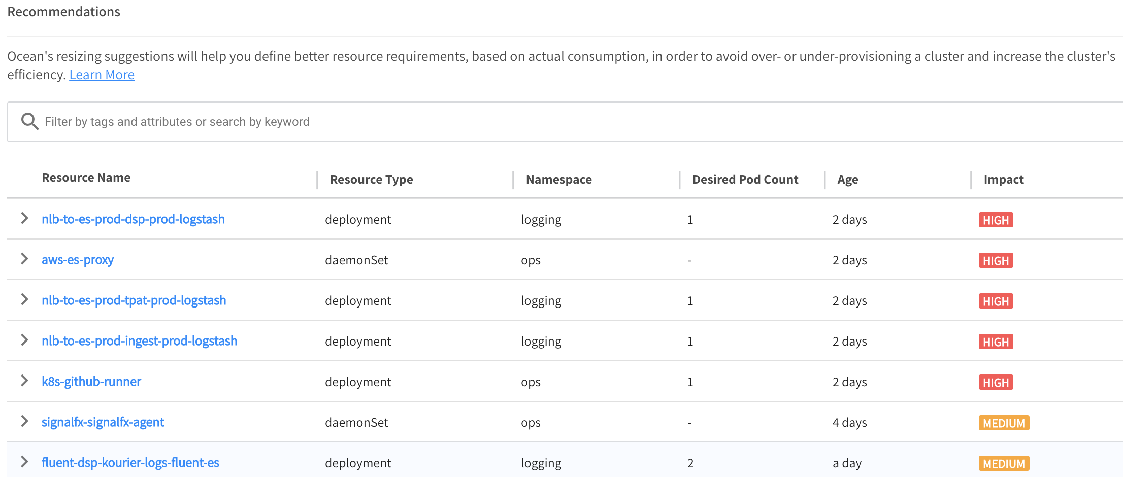 Currently, Ocean generates recommendations for Kubernetes deployments, statefulsets, and daemonsets.