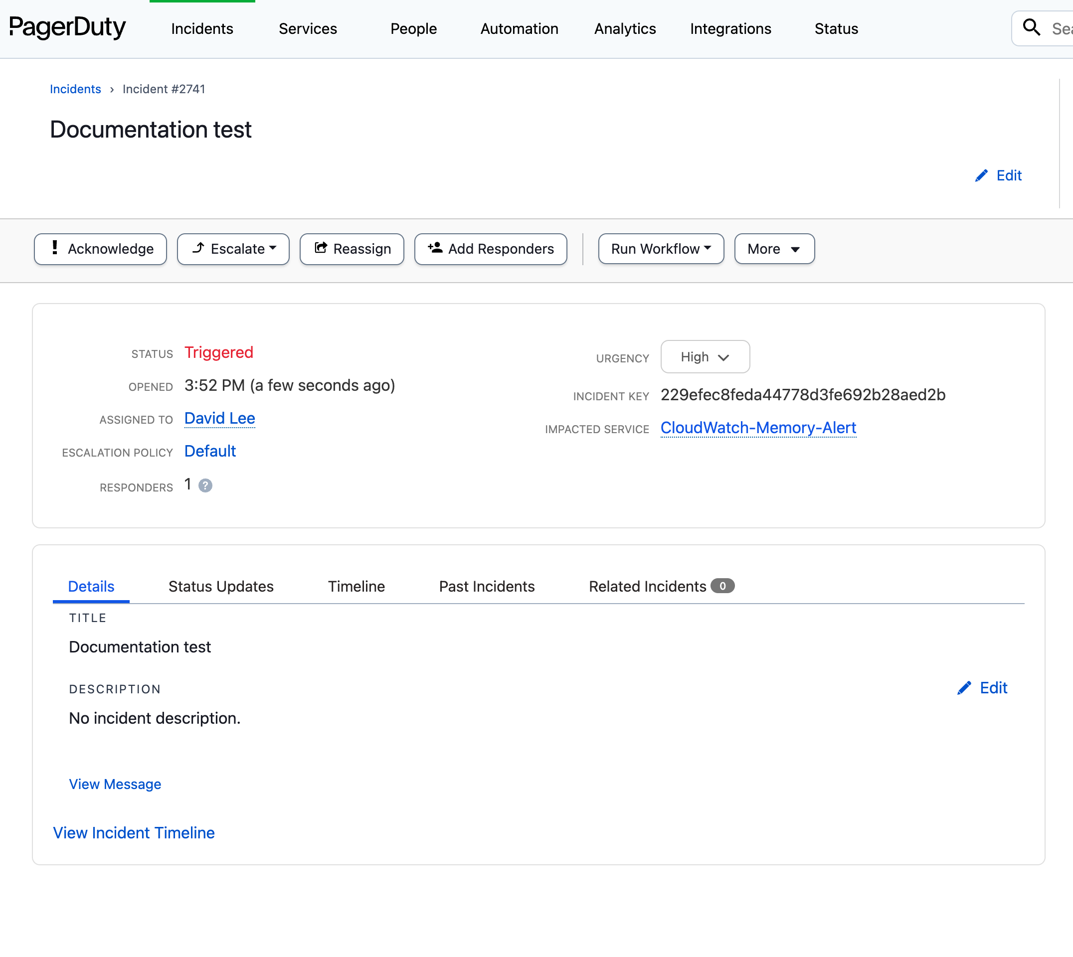 | Incident Title | Title for PagerDuty Incident to be created by this workflow execution. | True |