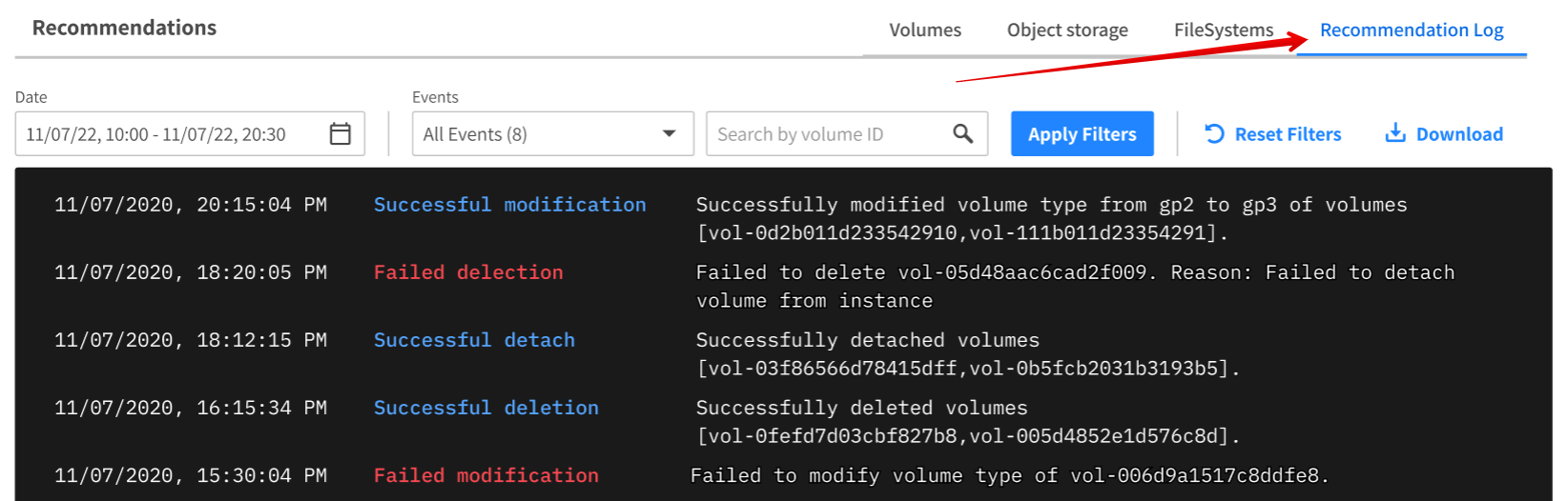 Spot Storage keeps a log of the actions you have taken based on the Recommendations presented.